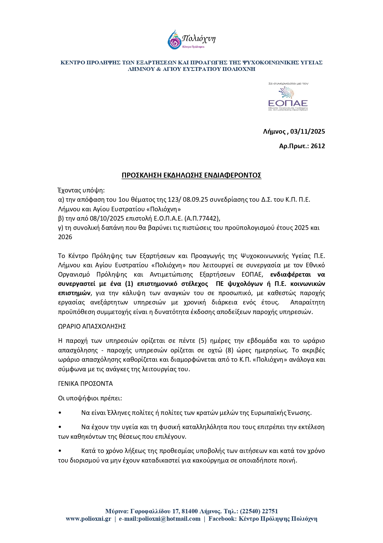 Ανακοίνωση για την εκδήλωση ενδιαφέροντος πρόσληψης προσωπικού