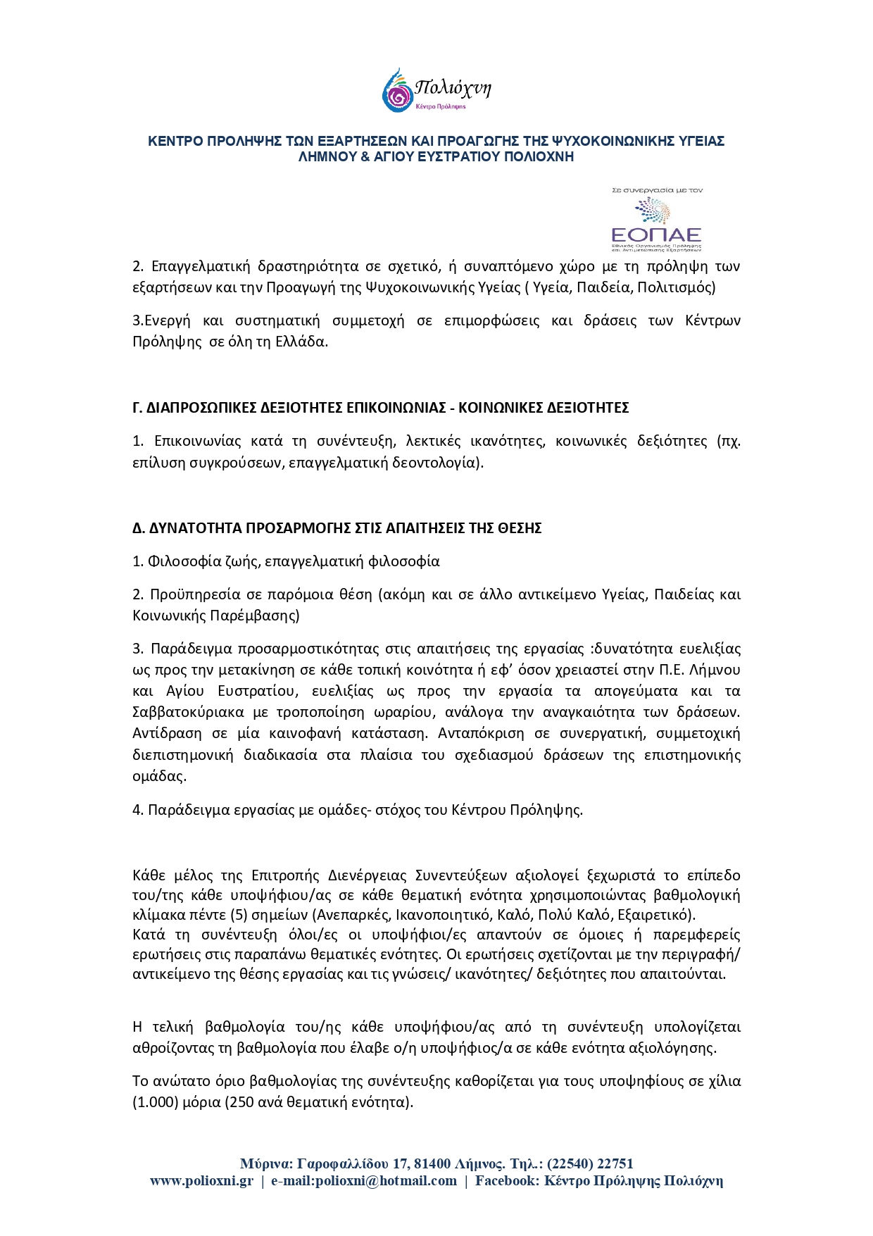 Διεξαγωγή επαγγελματικής, ψυχολογικής και οικονομικής συμβουλευτικής σε ανέργους στα πλαίσια της πράξης “ΕΡΓΑΣΙΑ ΜΕ ΙΣΕΣ ΕΥΚΑΙΡΙΕΣ Ε.Μ.Ι.Ε.” της Αναπτυξιακής Σύμπραξης Π.Ε. Λέσβου Λήμνου ΓΙΑ ΑΠΑΣΧΟΛΗΣΗ ΧΩΡΙΣ ΔΙΑΚΡΙΣΕΙΣ.