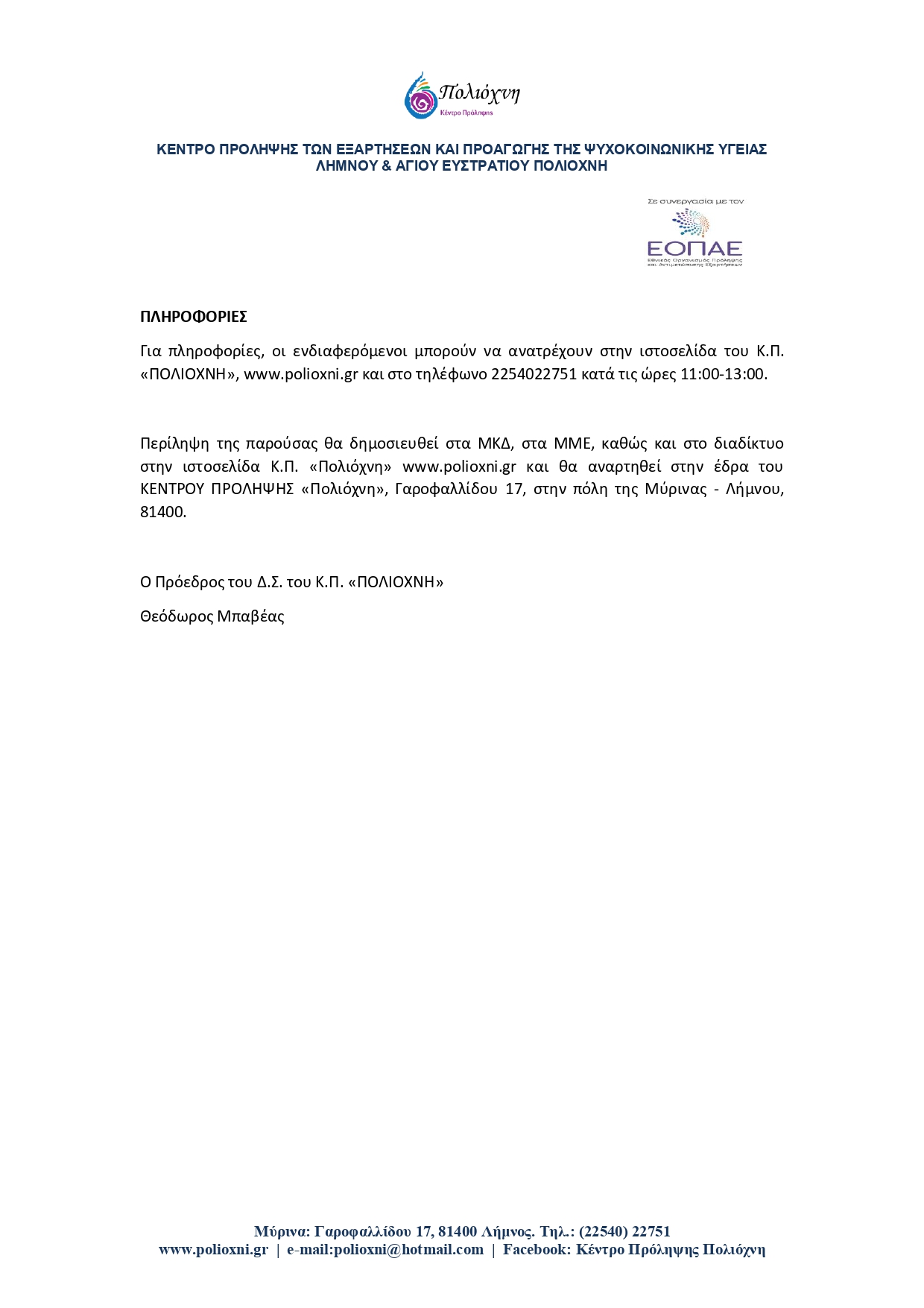Ομιλία ενημέρωσης και ευαισθητοποίησης, κατόπιν πρόσκλησης του Συλλόγου Γονέων και Κηδεμόνων του ΕΠΑΛ Μύρινας με θέμα “Η πρόληψη των Ουσιοεξαρτήσεων”.