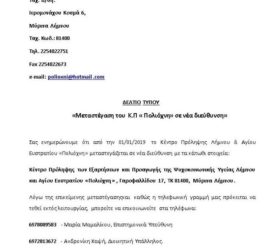 Το επιστημονικό προσωπικό του Κέντρου Πρόληψης των Εξαρτήσεων και Προαγωγής της Ψυχοκοινωνικής Υγείας Λήμνου και Αγίου Ευστρατίου «Πολιόχνη», στα πλαίσια του προγραμματισμού των δράσεων του κατά το χρονικό διάστημα Οκτώβριος 2019 – Ιούνιος 2020, καλεί τους συλλόγους (πολιτιστικούς, αθλητικούς, γονέων κ.α.) του Δήμου Λήμνου και Δήμου Αγίου Ευστρατίου να καταθέσουν […]